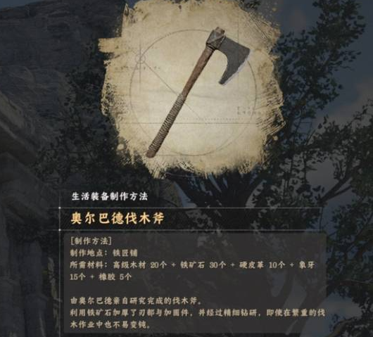 拾取制作书后,玩家需要按照配方凑齐材料,通常包含木材和象牙等资源,制作出树屋专属伐木斧。完成制作后,装备该斧头回到树屋周围,寻找体型粗壮的巨树进行砍伐,这样必出顶级木料。