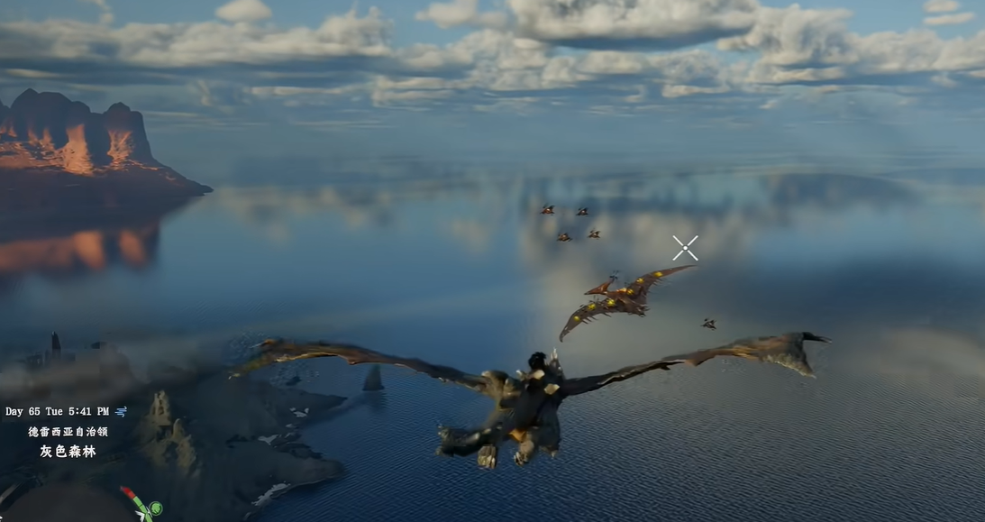 使用传送装置切换到飞行术研究基地,抵达空中区域后,玩家会发现一条机械翼龙在空中盘旋。