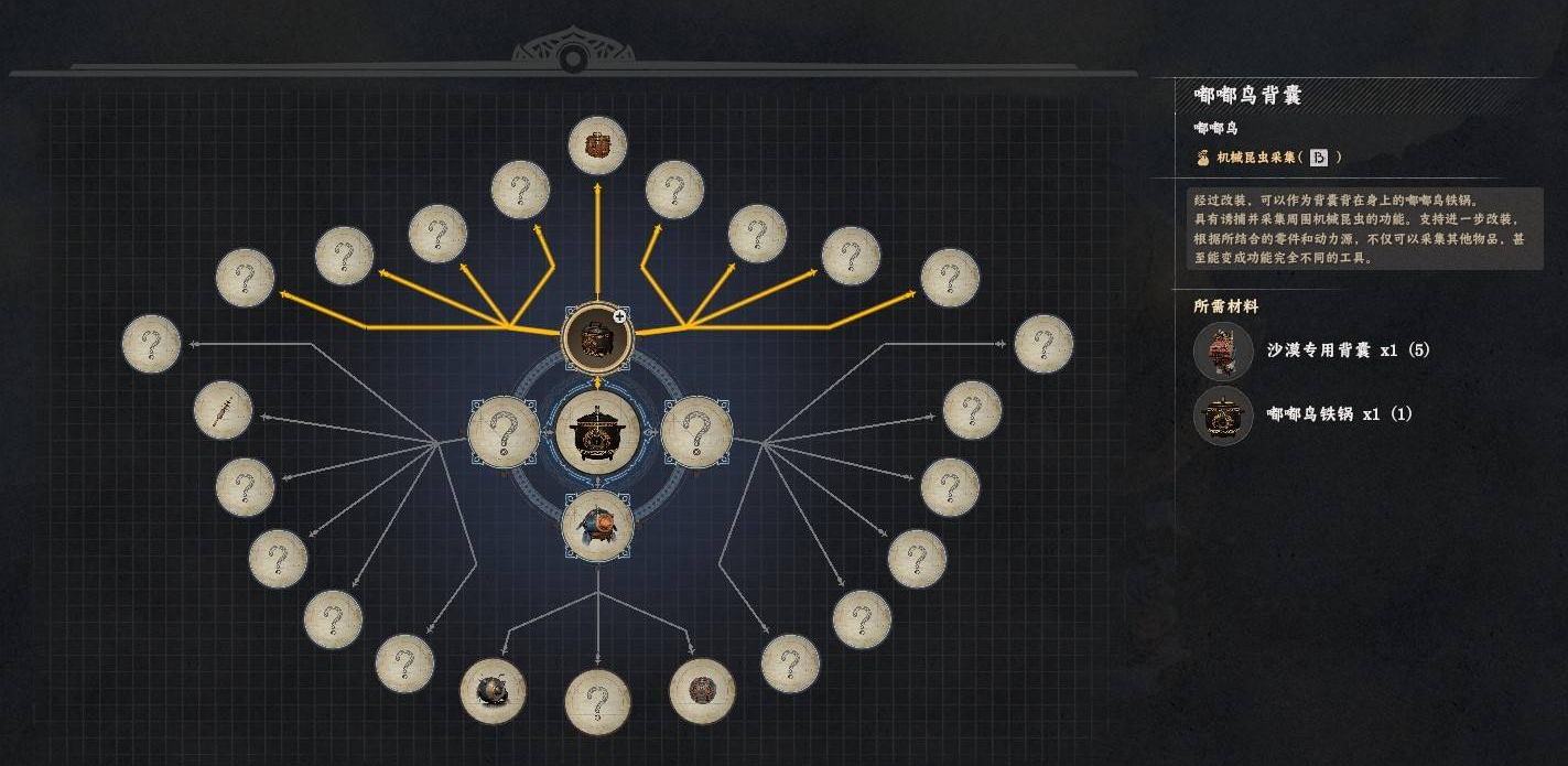 材料获取方面,货商的背囊可通过大地图随机拾取,宠物可辅助寻找,也可戴面罩威胁或攻击携带背囊的 NPC,但会触发通缉需快速撤离。清扫黄金鳞片盗贼团营地也有概率掉落沙漠专用背囊作为替代。嘟嘟鸟背囊所需的铁矿在狼丘营地山崖下及矿区大量产出,木材可通过砍树、废墟搜索或商店购买获取。