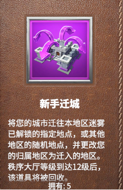 新手迁城:可以迁城至任意地区任意位置,但是会在大厅达到12级后回收,只有在建号时会赠送五个,无其他获取渠道。
