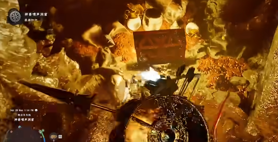 在尽头的位置获得宝箱,拾取黄金盾牌。