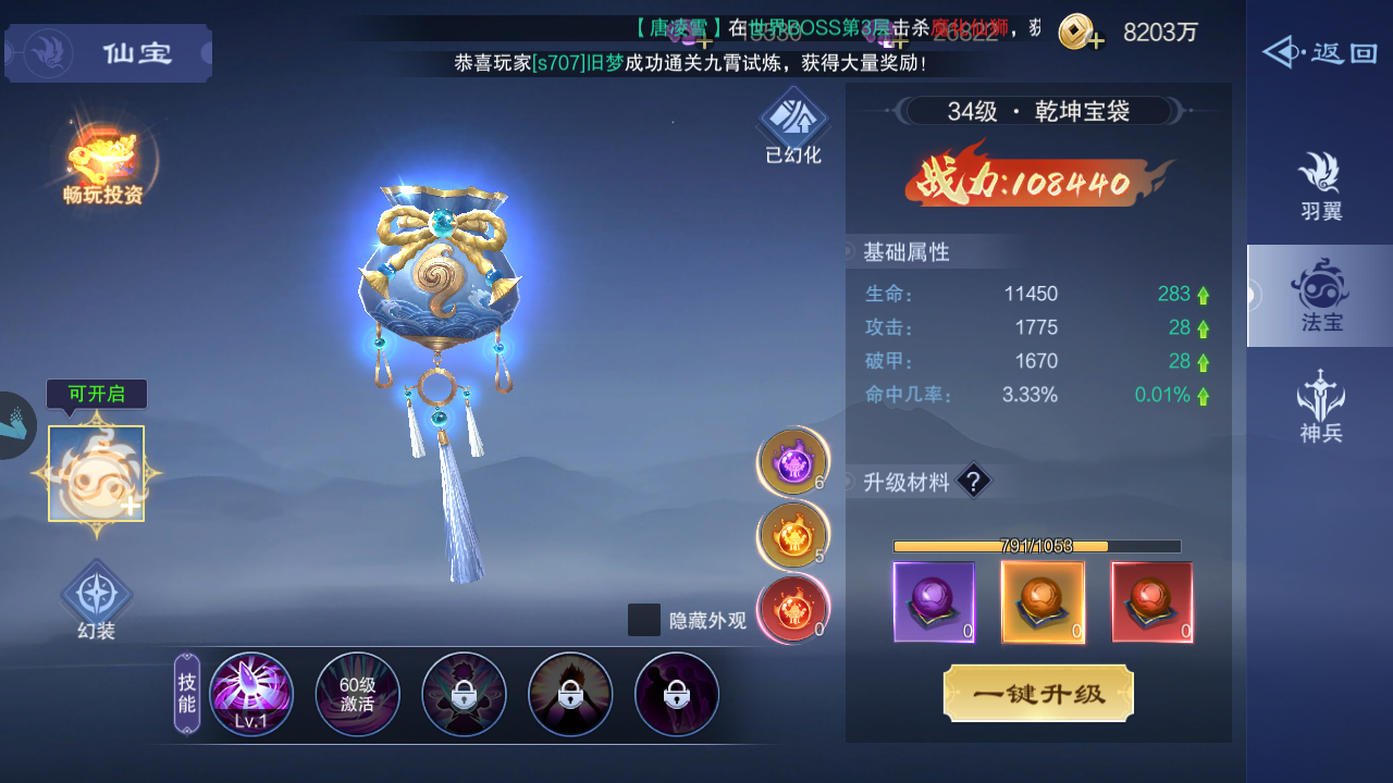 【初级法宝精华】增加50点法宝升级经验,可以通过九霄试炼、仙魔战场、运营活动等获得