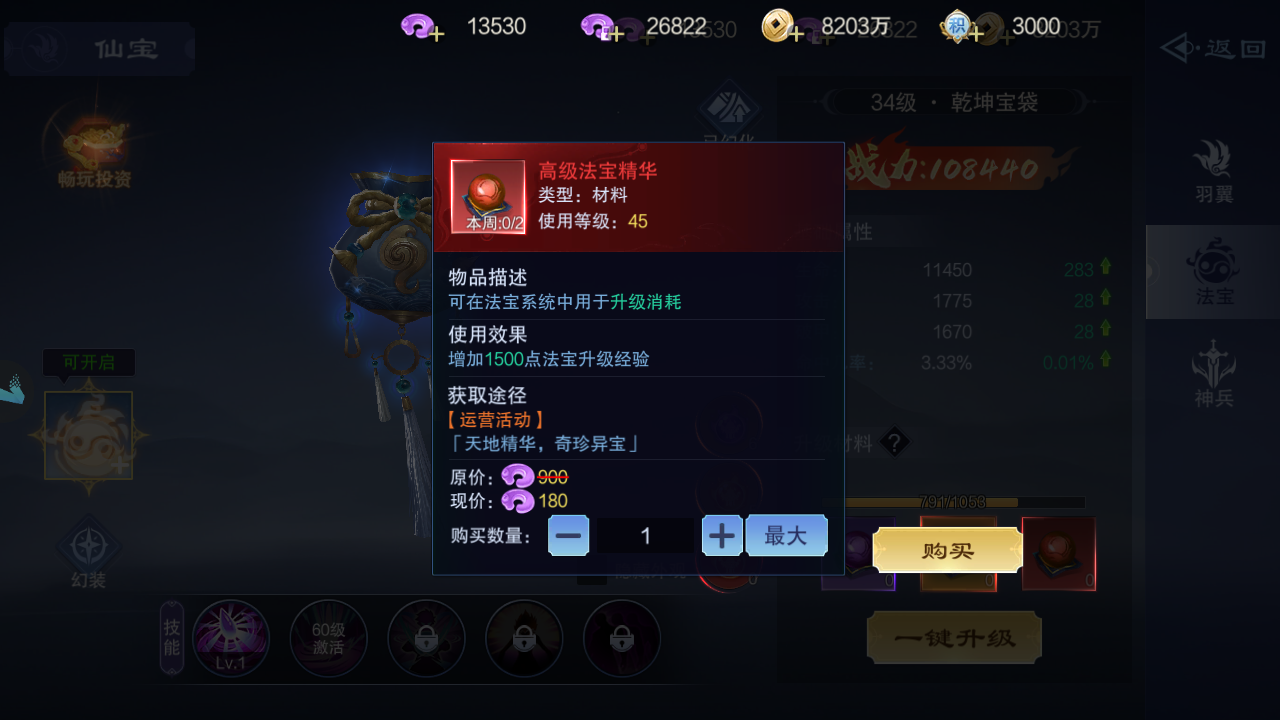 【高级法宝精华】增加1500点法宝升级经验,可以通过运营活动等获得