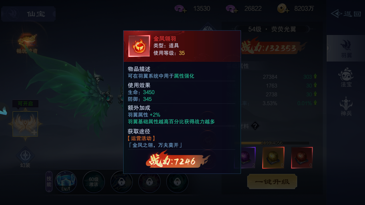 【金凤翎羽】增加生命值和防御值,额外属性:羽翼属性百分比加成,羽翼基础属性越高百分比获得战力越多,可以通过运营活动等获得