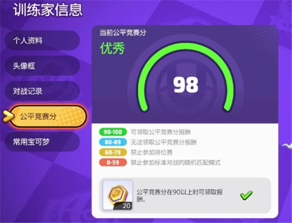 在训练家信息里的公平竞赛分保持在90~100区间每天可以领20亿奥斯币