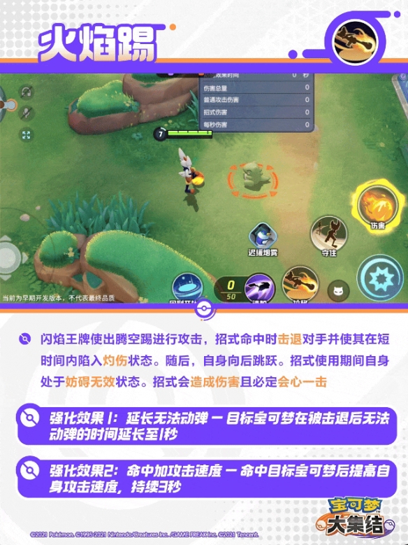 闪焰王牌向指定方向踢出火焰球进行攻击,处于火焰球路径上的宝可梦都将受到伤害,并在短时间内陷入灼伤状态