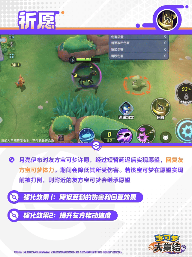 月亮伊布对友方宝可梦许愿,经过短暂延迟后实现愿望,回复友方宝可梦体力。期间会降低其所受伤害。