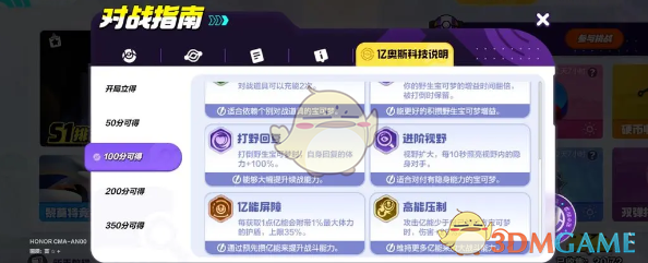 3、100分可得:招式冷缩、高能压制或对战道具充能,分别具有减少节能冷却时间、增伤以及道具充能两次的作用。