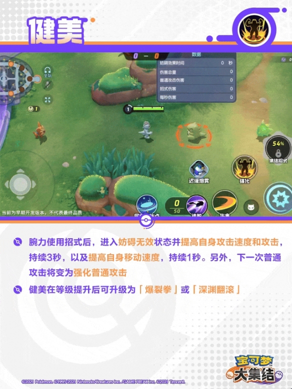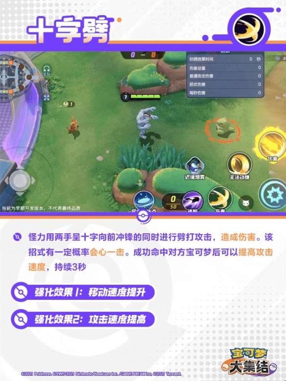 怪力使用招式后使自身进入妨碍无效状态并提高移动速度,此移动速度提升的效果会快速衰减,持续5秒。下次普通攻击将抱起对方宝可梦造成伤害和持续1.35秒的无法动弹效果,并将其摔向地面,再次造成伤害