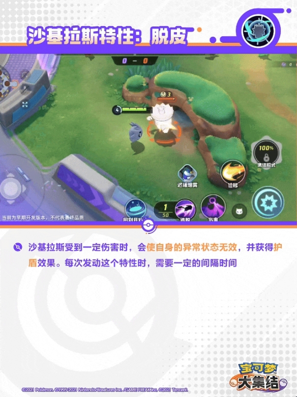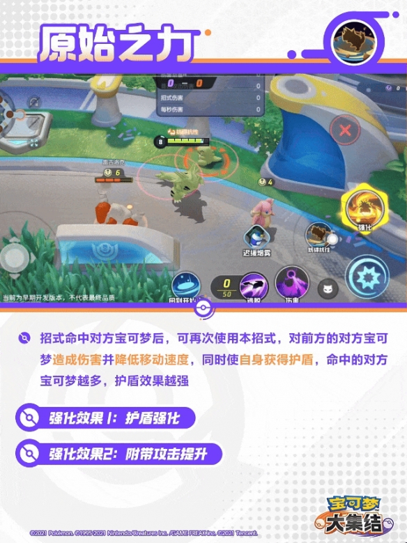 招式命中对方宝可梦后,可再次使用本招式,对前方的对方宝可梦造成伤害并降低移动速度,同时使自身获得护盾,命中的对方宝可梦越多,护盾效果越强。