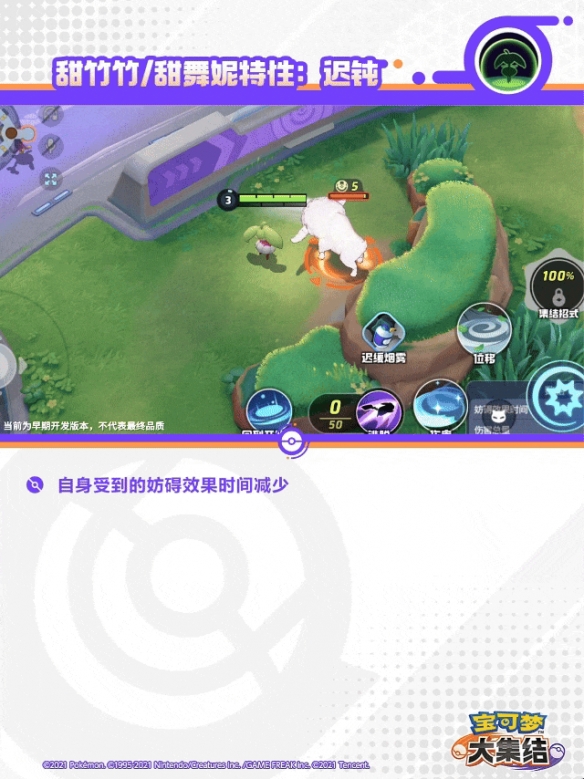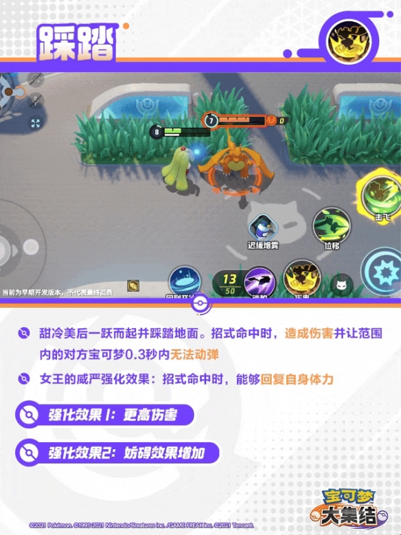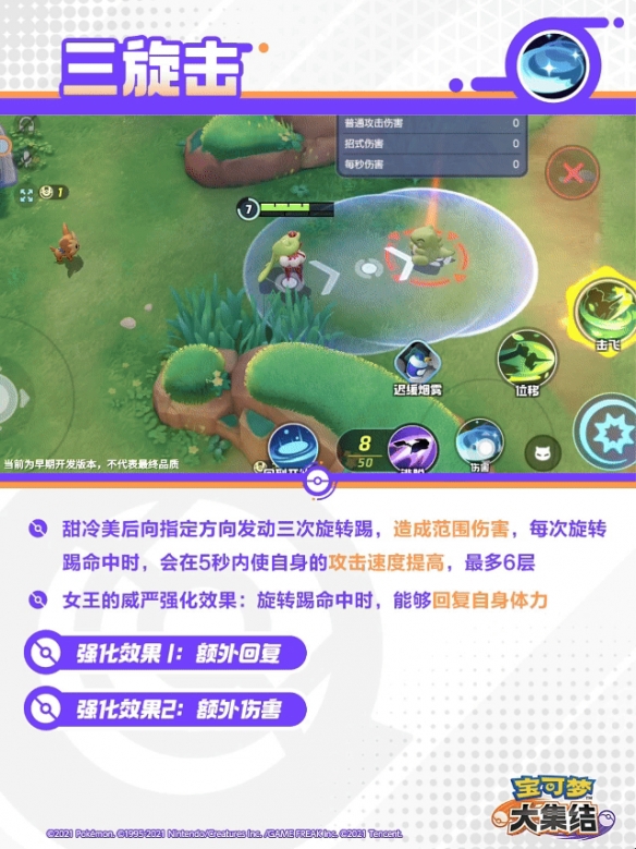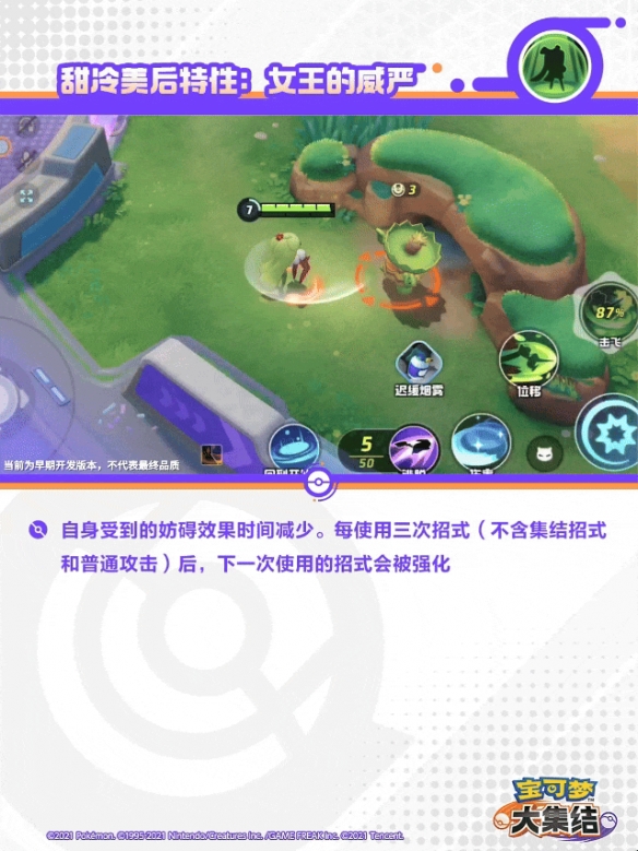 甜冷美后的第三下普通攻击为强化普通攻击,位移到指定位置造成更多伤害,并散发甜甜香气降低对方宝可梦防御,持续1秒。