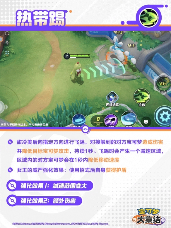 甜冷美后向指定方向进行飞踢,对接触到的对方宝可梦造成伤害并降低目标宝可梦攻击,持续1秒。飞踢时会产生一个减速区域,区域内的对方宝可梦会在1秒内降低移动速度。