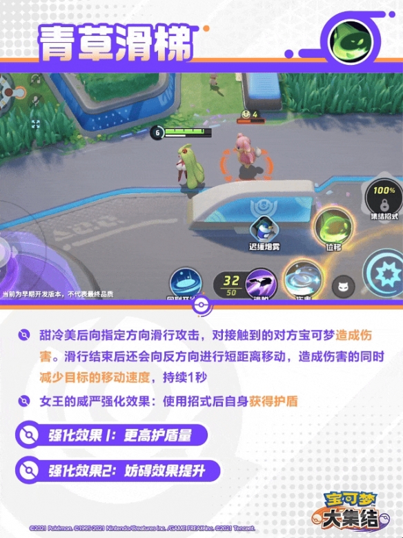 甜冷美后向指定方向滑行攻击,对接触到的对方宝可梦造成伤害。滑行结束后还会向反方向进行短距离移动,造成伤害的同时减少目标的移动速度,持续1秒。