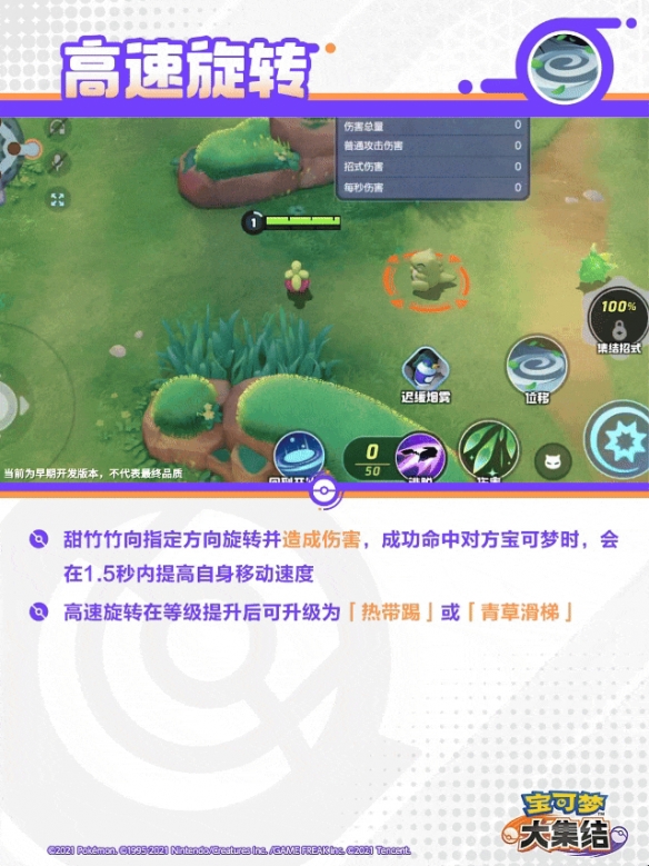 甜竹竹向指定方向旋转并造成伤害,成功命中对方宝可梦时,会在1.5秒内提高自身移动速度。