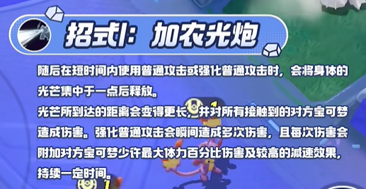 第三次普通攻击为强化普通攻击,会射出较长的射线,对接触到的对方宝可梦造成伤害,并附带目标宝可梦少许最大体力百分比伤害。