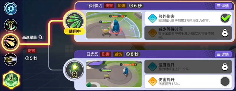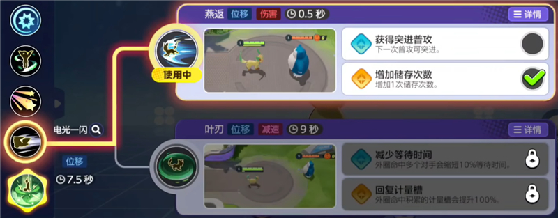 飞叶快刀:叶伊布射出5片叶子,切斩目标进行攻击。如果五片叶子全部命中同一只宝可梦,会获得护盾,持续3秒。