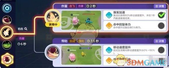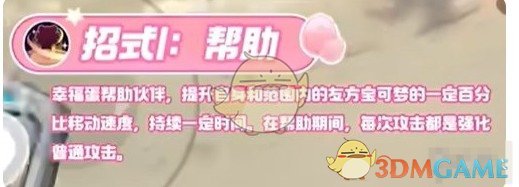 幸福蛋帮助伙伴,提升自身和范围内的友方宝可梦的一定百分比移动速度,持续一定时间。在帮助期间,每次攻击都是强化普通攻击。