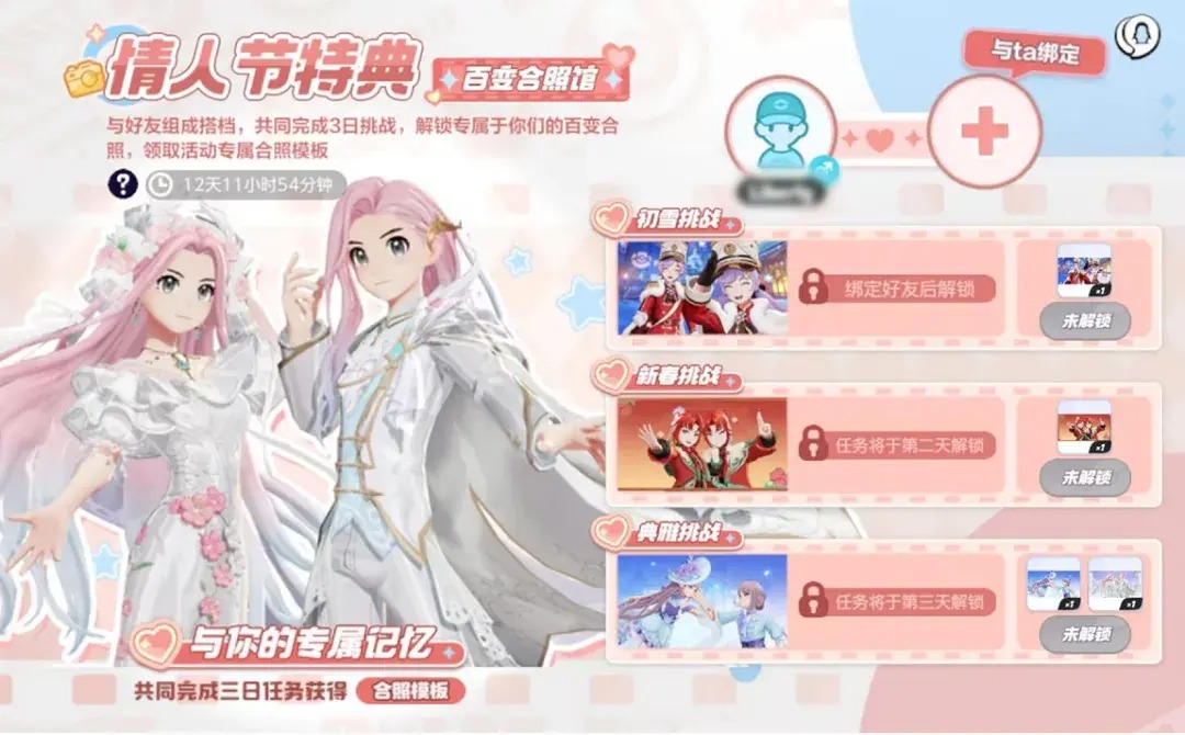 活动期间,每完成1次挑战任务都可以获得1个指定时装合照(妙拍机动作-新春、妙拍机动作-初雪、妙拍机动作-典雅),累计完成3天后,情人节活动专属合照模版(妙拍机动作-誓约)等你来拿!