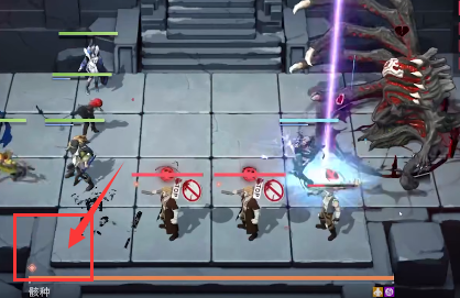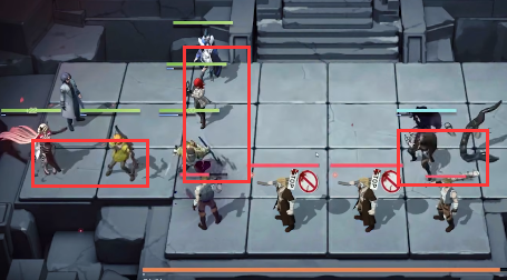 1、站位如图所示,前方放置防御角色和战士,后方放置远程输出,先放在左侧把左侧的怪清掉。