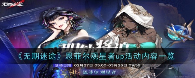 在《无期迷途》游戏中,恩菲尔观星者up活动将会在2月27日正式上线,关于这次的活动还有很多玩家并不是很了解,那么接下来就由小编给大家具体介绍一下活动内容,各位可以选取自己喜欢的up角色在限定时间内进行抽取。