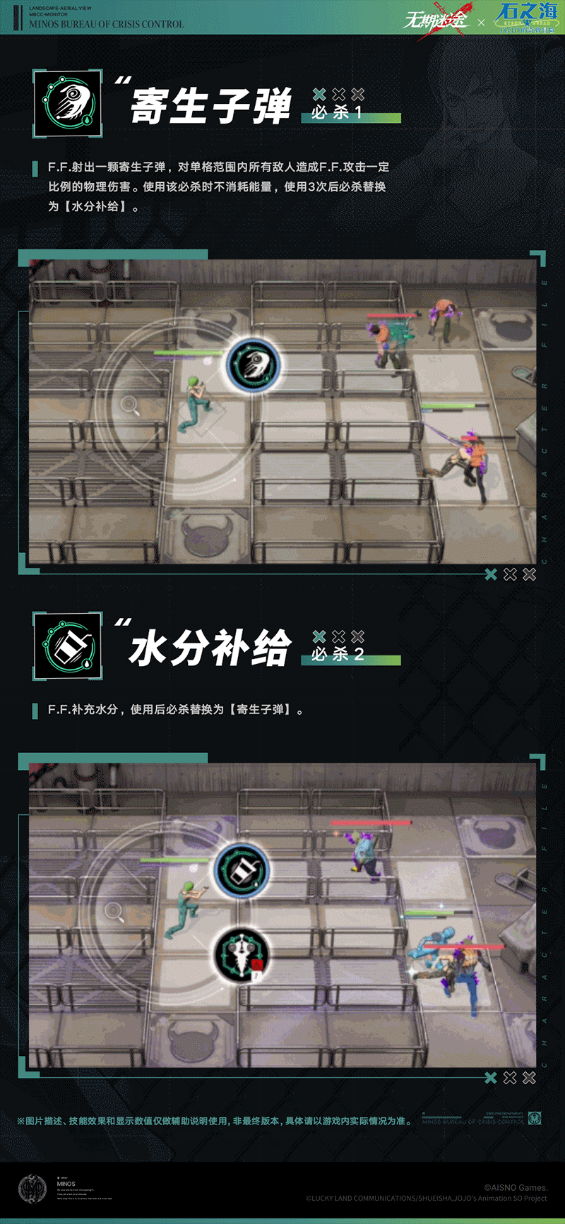 F.F,射出一颗寄生子弹,对单格范围内所有敌人造成F.F.攻击一定比例的物理伤害。使用该必杀时不消耗能量,使用3次后必杀替换为【水分补给】。