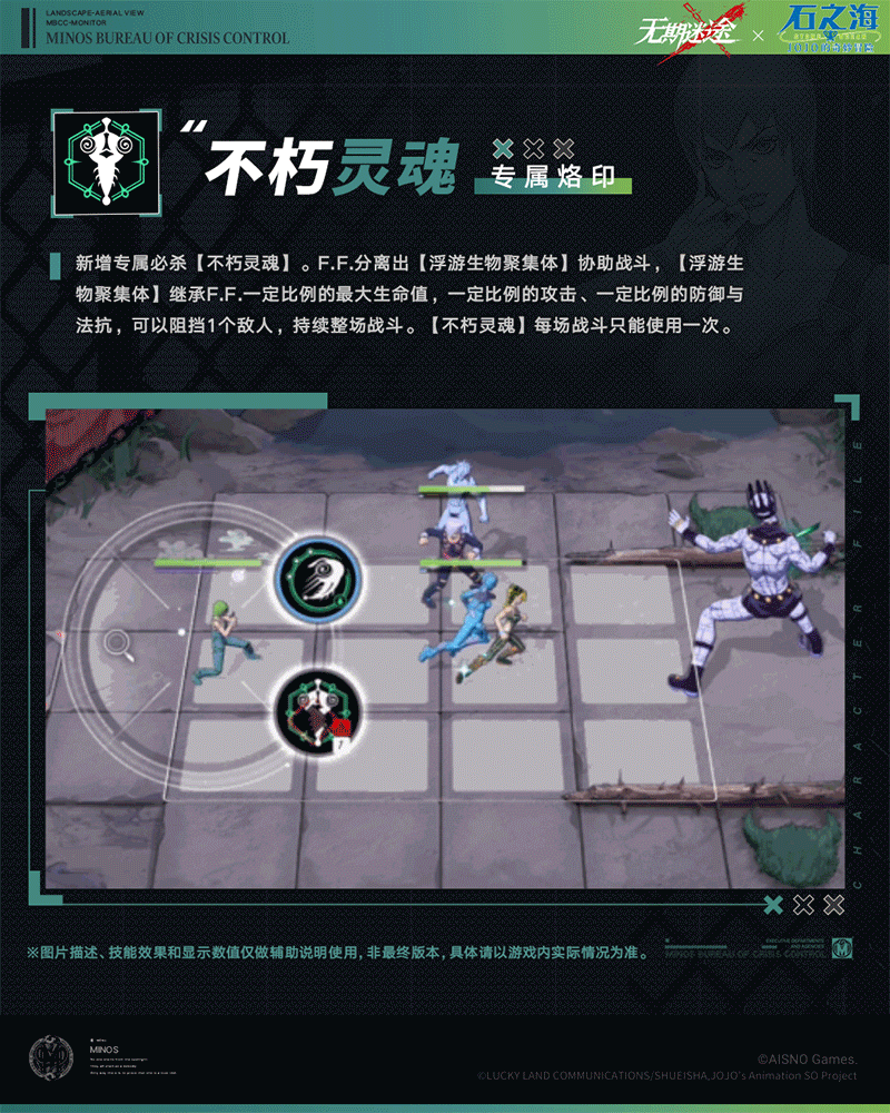 F.F.分离出【浮游生物聚集体】协助战斗,【浮游生物聚集体】继承F.F,一定比例的最大生命值,一定比例的攻击、一定比例的防御与法抗,可以阻挡1个敌人,持续整场战斗。【不朽灵魂】每场战斗只能使用一次。