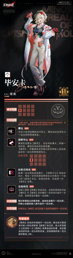 毕安卡作为物理输出型禁闭者,她的所有伤害均有一定比例的提升,尤其对已遭受核心击破的敌人,其伤害将进一步增加一定比例。