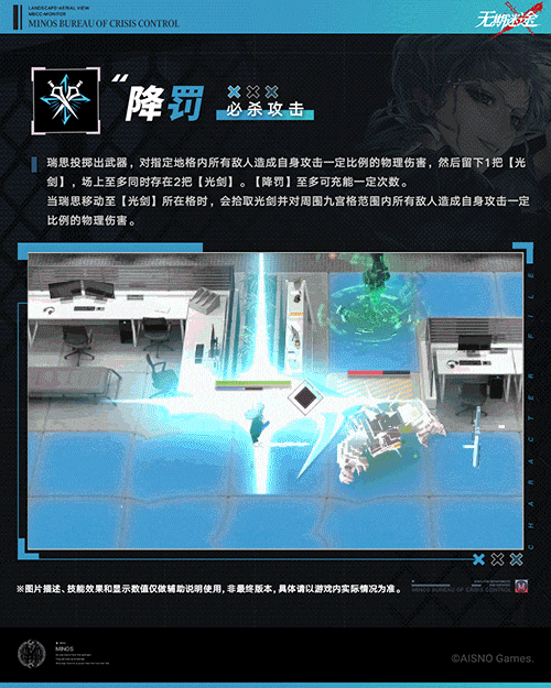 瑞思投掷出武器,对指定地格内所有敌人造成自身攻击一定比例的物理伤害,然后留下1把【光剑】,场上至多同时存在2把【光剑】。【降罚】至多可充能一定次数。