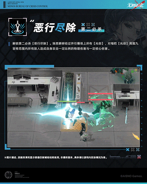 解锁第二必杀【恶行尽除】。瑞思瞬移经过并引爆场上所有【光剑】,对每把【光剑】周围九宫格范围内所有敌人造成自身攻击一定比例的物理伤害与一定核心伤害。