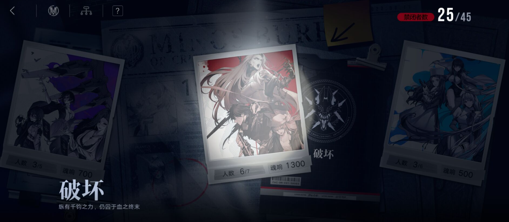 在管理局-诫典中我们能看到破坏这一行,简而言之只要收集齐破坏这一行中的所有角色即可