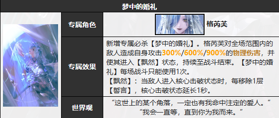 敌人每有1颗【诡秘核心】被击破,格芮芙对其施加1层【誓言】,当敌人进入核心击破状态时,移除所有【誓言】,每移除1层,受到格芮芙自身攻击300%的物理伤害。