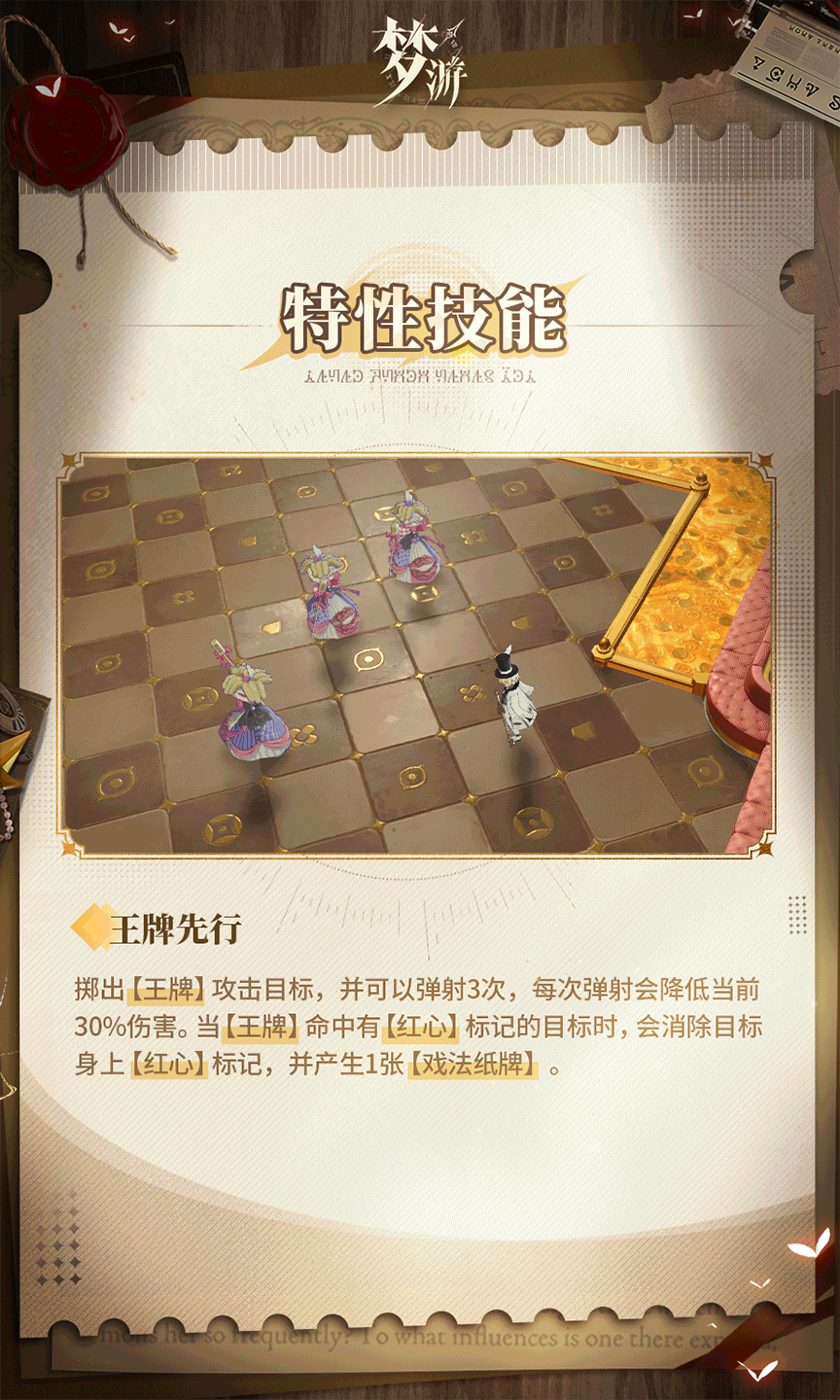技能描述:掷出【王牌】攻击目标,并可以弹射3次,每次弹射会降低当前30%伤害。当【王牌】命中有【红心】标记的目标时,会消除目标身上【红心】标记,并产生1张【戏法纸牌】。