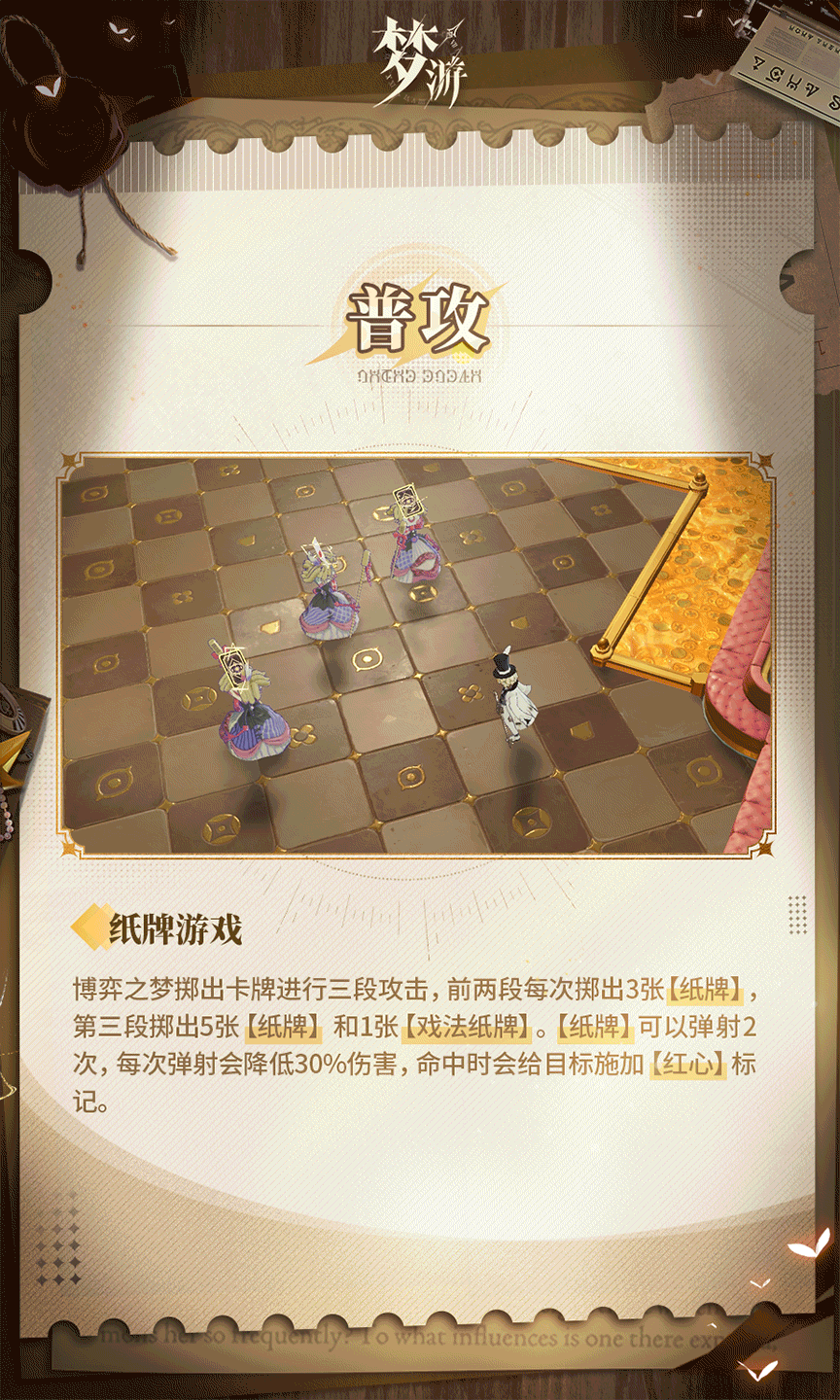 技能描述:博弈之梦掷出卡牌进行三段攻击,前两段每次掷出3张【纸牌】,第三段掷出5张【纸牌】和1张【戏法纸牌】。【纸牌】可以弹射2次,每次弹射会降低30%伤害,命中时会给目标施加【红心】标记。