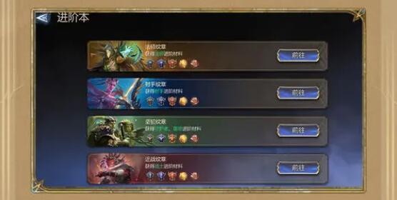 进阶材料可通过刷纹章副本获取,不同类型的英雄需要不同纹章材料,随着进阶等级的提升所要求的纹章材料等级也将提升,进阶5紫星与6紫星时,还需要传说精粹与神话精粹,需要我们通关更高难度的纹章副本方可获取。
