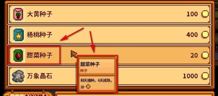 甜菜根是由甜菜种子经过秋天播种收获后获得,中间需要六天的生长期。甜菜种子可以在绿洲商店购买,也可以通过种子生产器获得。玩家不能通过送礼物与齐先生提高友好值。但是将10颗甜菜放进刘易斯的冰箱里完成任务。