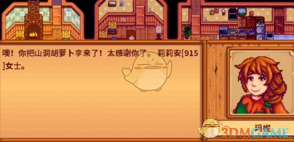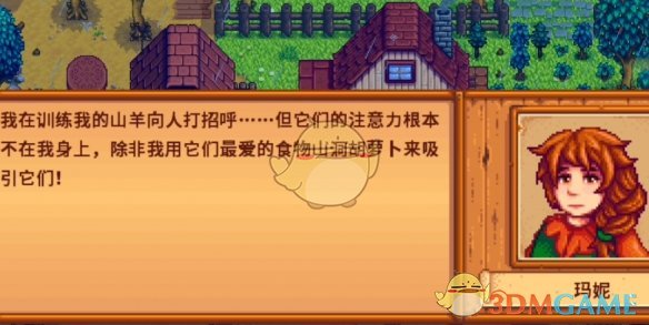 1、首先我们需要和玛妮NPC互动,赠送礼物将亲密度提升到3颗心,她会来农场找我们帮忙。
