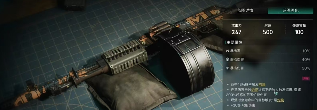 要爆炸了这款霰弹枪非常的出色,因为它的弹夹容量特别的高,射击速度也比较快,攻击力比较好。要说它的属性,如果增加10%的暴击率,那么会增加40%的弱点伤害和30%的暴击伤害。如果打中了目标,就有18%的概率能够灼烧。其实灼烧之后肯定会影响到敌人,也会触发燃爆,一旦燃爆之后将会附加一层灼烧,并且它的伤害性将会提高30%。