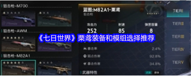 栗鸢在七日世界游戏中是一把强力的狙击枪,以其高伤害和弹射能力著称,是玩家在战斗中清理怪物的重要武器之一,通过合理的装备与模组搭配,栗鸢能够在游戏中发挥出极高的战斗力。下面就是《七日世界》栗鸢装备和模组选择推荐,大家可以参考一下!
