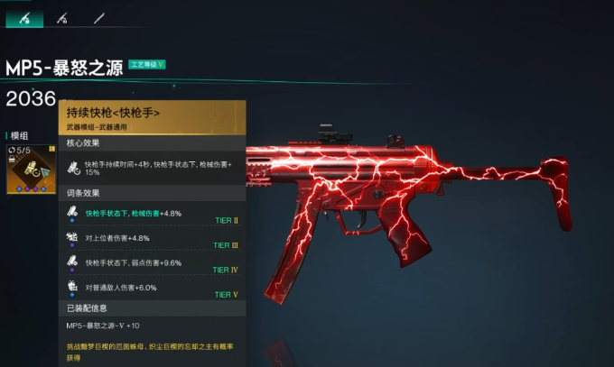 暴怒之源是一把具有特殊机制的冲锋枪,它带有快枪手效果,战斗中可以消耗生命继续射击,搭配快枪手层数的各项回血效果,同时生命值降低或是提升还可以增加枪械的伤害,基于这些特性,套装选择末土套装,可以提供伤害、伤害减免以及护盾,专属装备可以选择绿洲面罩和魔术师上衣,绿洲面罩可以增加快枪手效果,魔术师上衣可以在快枪手状态下增加更多输出,模组方面选择快枪手和暴击相关的内容,以更好地进行输出。