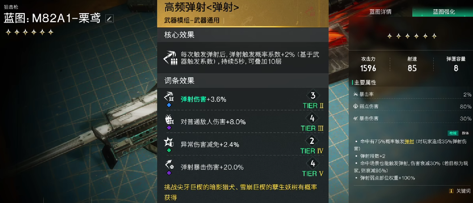 选择跟栗鸢搭配时主武器直接选择高频弹射,因为该模组触发三次弹射轨迹,就会对敌人造成覆盖式的打击,特别适合玩家在星辰污染区域当中攻打畸变群体。如果玩家需要强化单体爆发,这时候直接选择爆裂模组,此时单体伤害将会提升15%,而且范围伤害的半径将会扩大两米,比较适合boss战或者是精英怪的狙击。