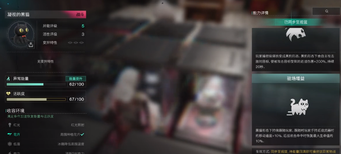 凝视的黑猫这就是一个战斗型的收容物,会具有两种不一样的攻击方式。第1种就是黑豹出击,一旦在投放之后,马上就会变成黑豹的形态。一旦被攻击,那这些目标承受的伤害在20秒的时间内就可以直接增加到200%。