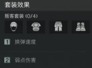单件装备就可以有效提升15%的换弹速度,在激烈战斗的过程中就能迅速地完成子弹装填,而且还有机会抢占先机。如果是两件套就可以有效提升10%的弱点伤害,对于射击精准度比较高的玩家而言,就可以迅速的打出可观的伤害。