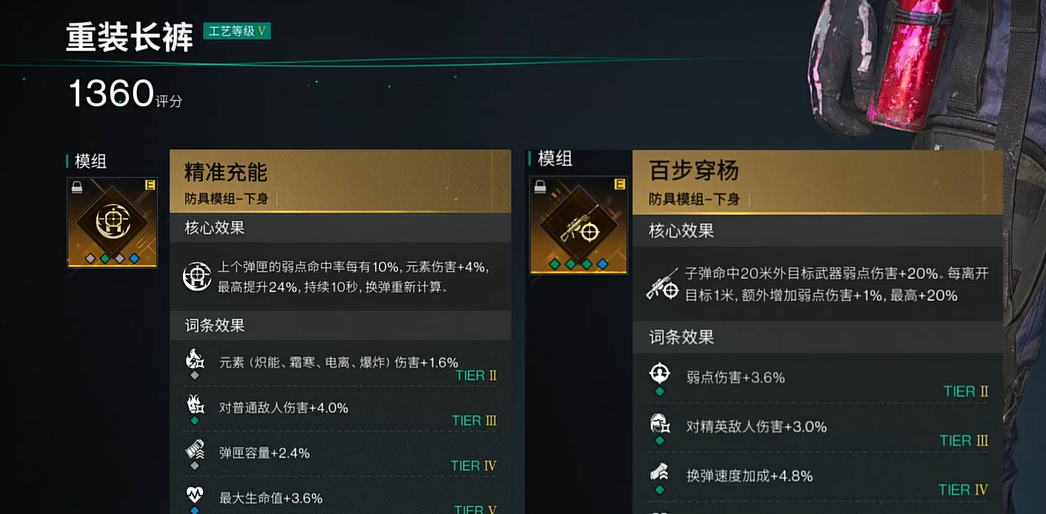 不过,巨物传说的核心优势就是爆弹伤害,所以选择能够提升爆弹伤害的模组非常重要。爆弹充能是对它极为合适的选择,因为它能够提高爆弹的伤害上限,让你的攻击更加致命。在模组的搭配上,头部模组可以选择精准打击或异常伤害,而面罩的爆破专注更能帮助你提升爆弹的效果。长裤推荐使用“百步穿杨”,让你在远程精准狙击时更具优势。鞋子则搭配掩护备战,提升生存能力。手套上则建议带上弱点强化,增加击中敌人弱点后的伤害。