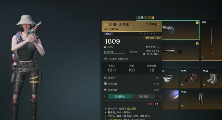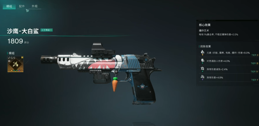 对大白鲨进行升星操作,这能够直接增加武器的基础属性,随着星级的提升,武器的攻击力等关键属性也会逐步增强,进而提升整体伤害输出,是提升武器性能的重要基础步骤,弹药的选择对大白鲨的伤害表现影响重大,紫钨穿甲弹是极佳选择,即便满星的大白鲨枪伤占比较高,紫钨穿甲弹仍能进一步提升伤害效果,且相较于金色子弹,它在伤害提升方面更具性价比,因此无需使用金色子弹。