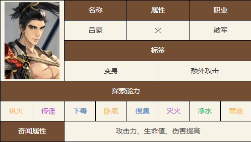 《如鸢》吕蒙是一位火属性的破军角色,有着独特的变身机制,在变身之后可以获得高额的伤害加成,因此很多玩家都想知道如鸢吕蒙的技能是什么,下面小编就给玩家们带来了如鸢吕蒙的技能天赋介绍。