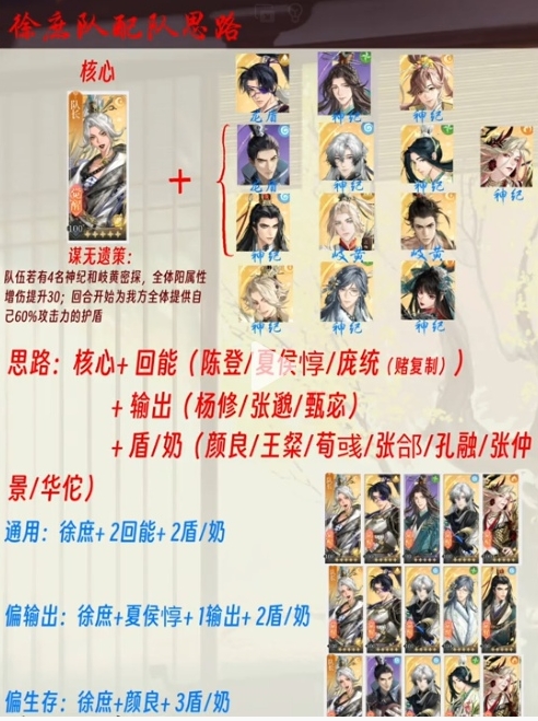 偏向生存阵容:以徐庶为基础,联合颜良,并配备三位防护/治疗型武将,以确保队伍的持久战力。