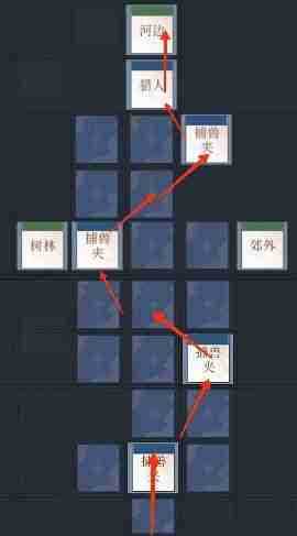 2、树林1:猎人-捕兽夹-前进右-捕兽夹-前进中-捕兽夹-前进中-捕兽夹-猎人-河边