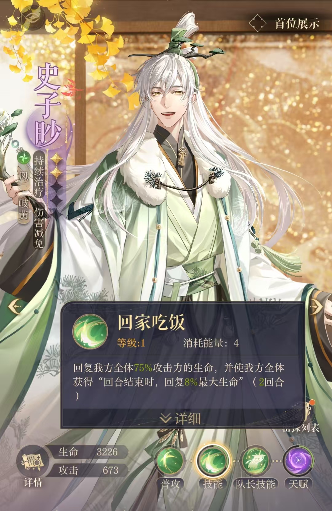 如鸢史子眇在游戏种子职业是岐黄,技能主要效果和定位是群体治疗和减伤,虽然史子眇的减伤效果在没有搭配好命盘词条的情况下表现不是很明显。但是治疗效果和回复的血量还是很客观的的。所以在阵容的搭配上也比较适配,推荐玩家搭配史子眇+王粲+颜良+孙尚香+阿蝉。