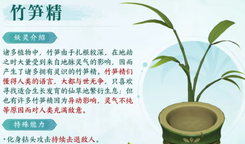 在游戏里常见的各种植物精怪中,玩家们经常会接触到的一种是竹笋精、荷花妖、南瓜精等。这几种植物在战斗的时候都能成为玩家们的帮手,发挥出不同的作用,比如说竹笋精可以帮助大家击退敌人,而南瓜精可以阻拦敌方的脚步,荷花妖可以给对面下毒等。
