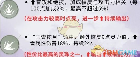 2、玉索揽月命中后,额外恢复9点灵力值,个雷属性伤害18%,持续24S。